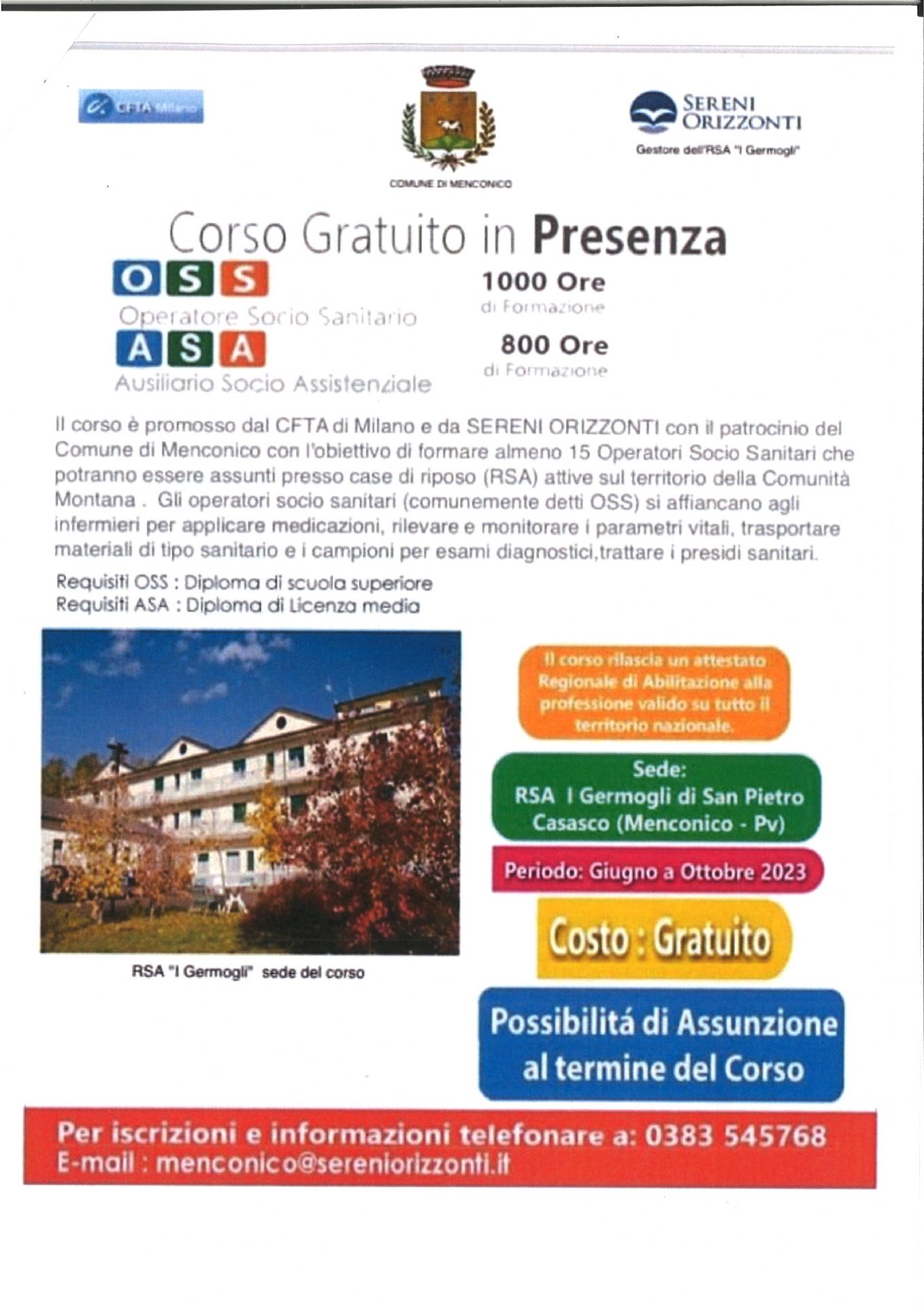 Cfta di milano e sereni orizzonti, patrocinati dal comune di menconico, promuovono il corso di formazione gratuito per asa e oss con possibilità di assunzione al termine del corso.