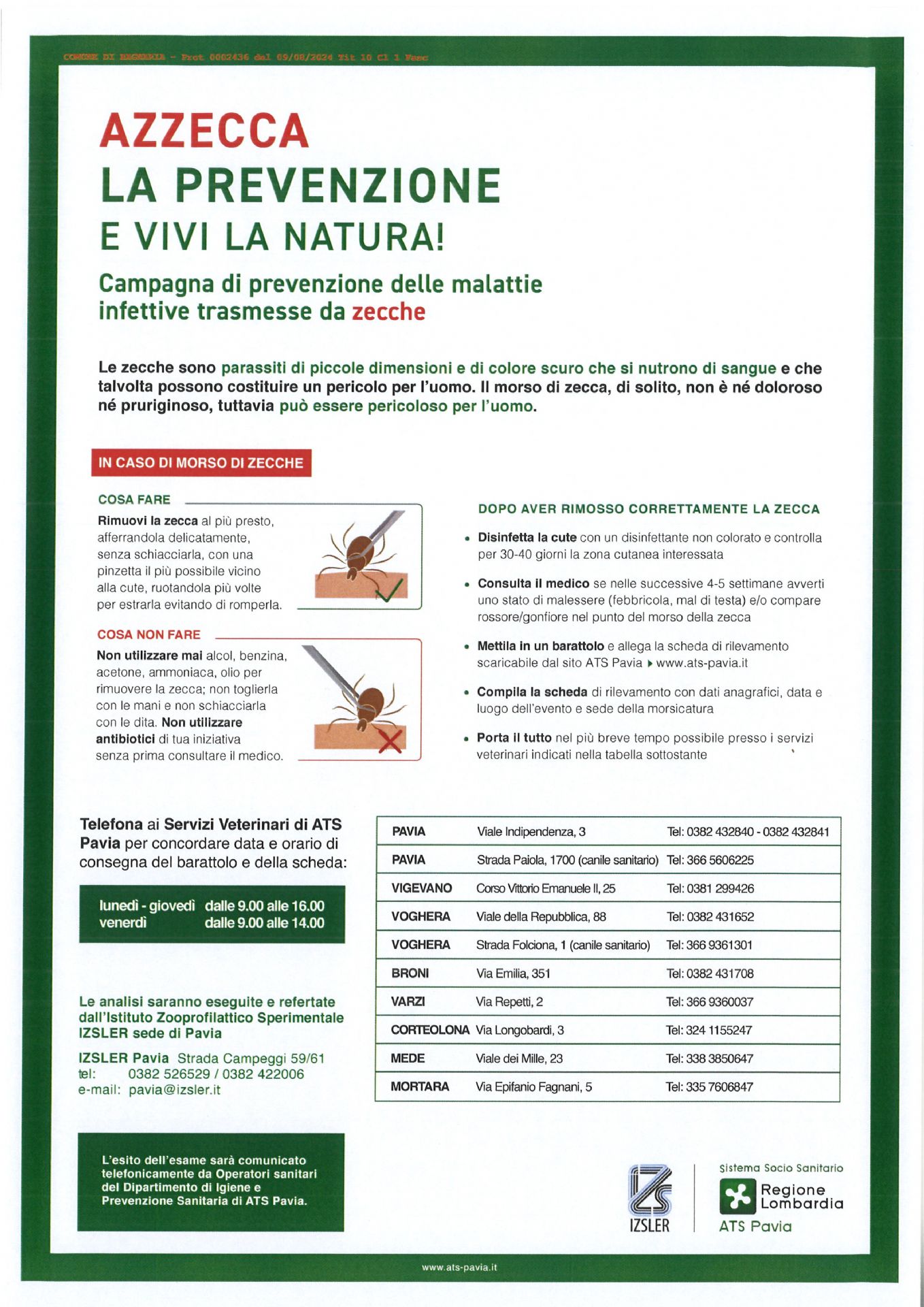 Descrizione Azzecca la prevenzione e vivi la natura-Campagna di prevenzione elle malattie infettive trasmesse da zecche A cura di Ufficio Anagrafe Stato Civile Ultimo aggiornamento pagina: 10/08/2024 11:05:54