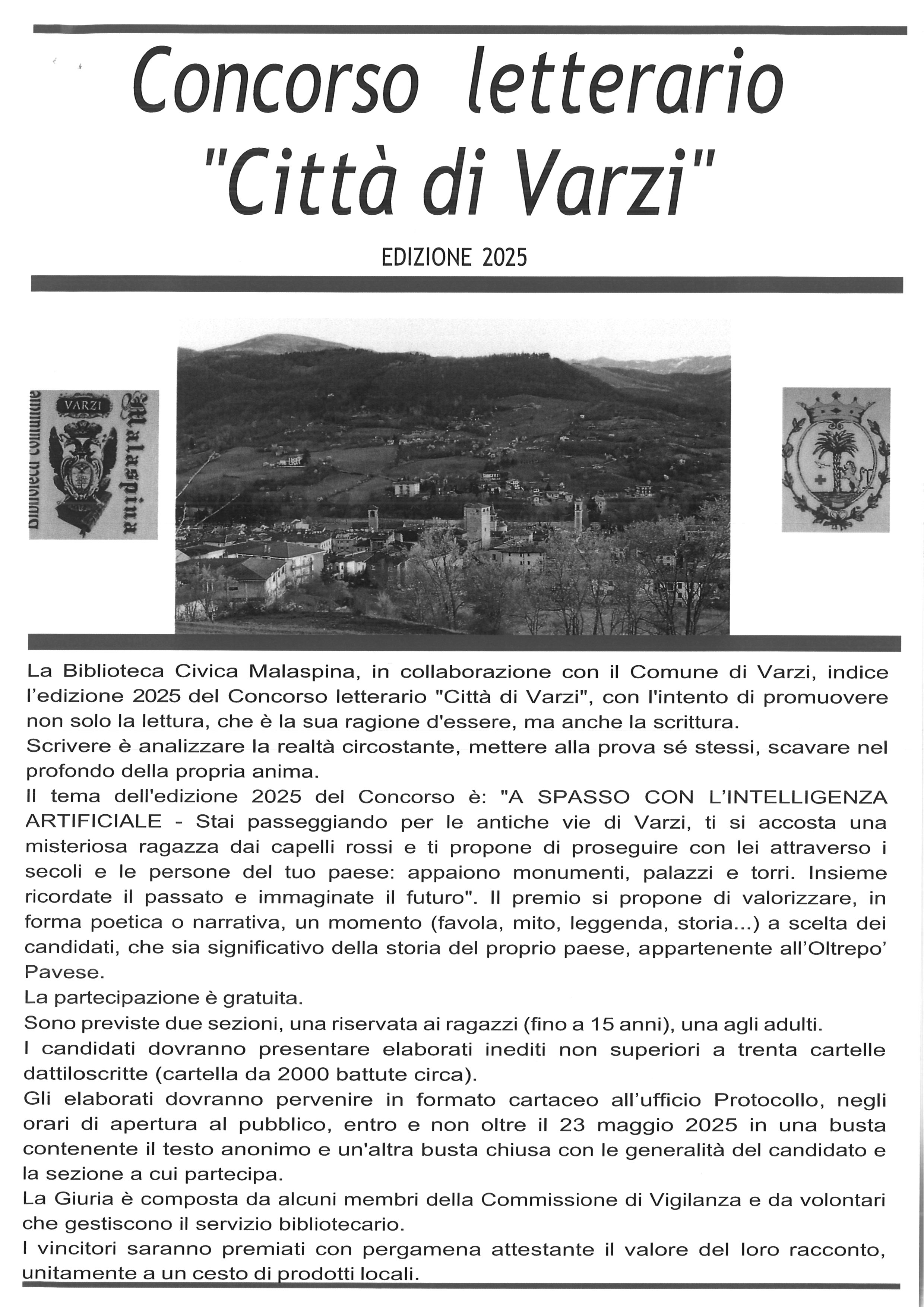 La Biblioteca Civica Malaspina, in collaborazione con il Comune di Varzi, indice l’edizione 2025 del Concorso letterario "Città di Varzi", con l'intento di promuovere non solo la lettura, che è la sua ragione d'essere, ma anche la scrittura.