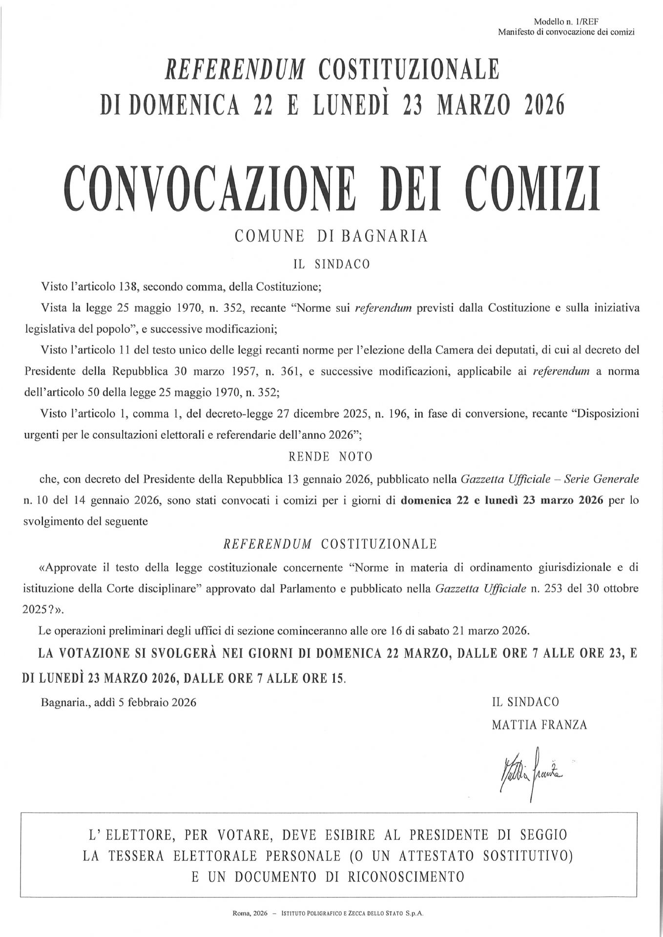 Descrizione Convocazione dei Comizi per i giorni di domenica e lunedì 23 marzo 2026 per lo svolgimento del Referendum Costituzionale A cura di Ufficio Anagrafe Stato Civile Ultimo aggiornamento pagina: 05/02/2026 10:03:25