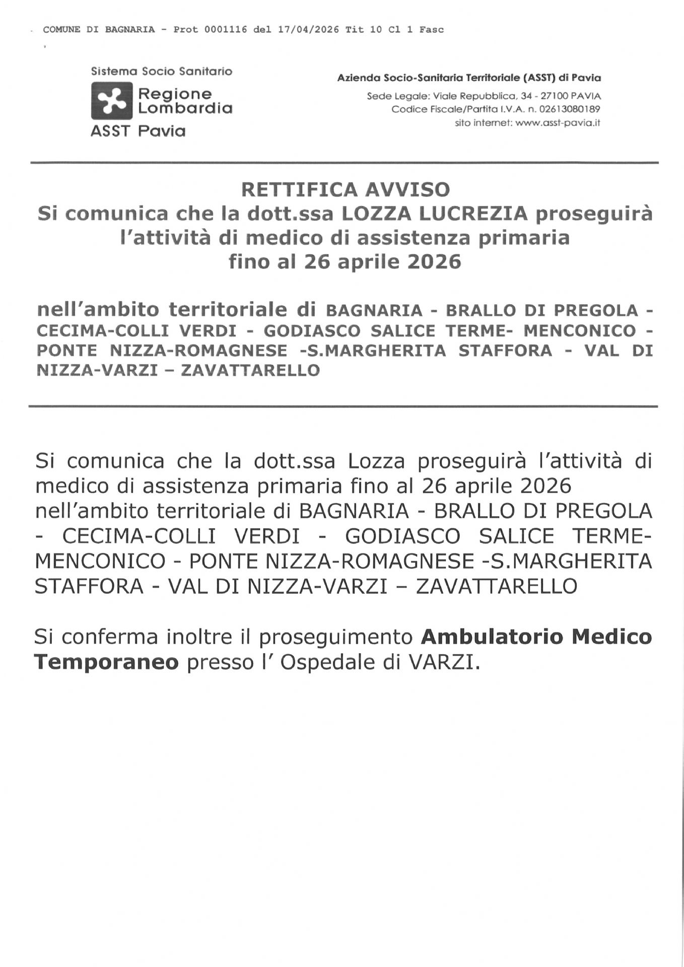 Descrizione Attività di medico di assistenza primaria Dott.ssa Lozza Lucrezia A cura di Ufficio Anagrafe Stato Civile Ultimo aggiornamento pagina: 18/04/2026 08:41:59