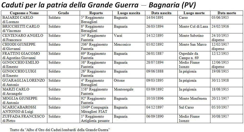 Descrizione In occasione del Centesimo Anniversario della Grande Guerra, Bagnaria vuole ricordare i suoi concittadini caduti in quel tragico evento di cent'anni fa.Il SindacoMattia Franza